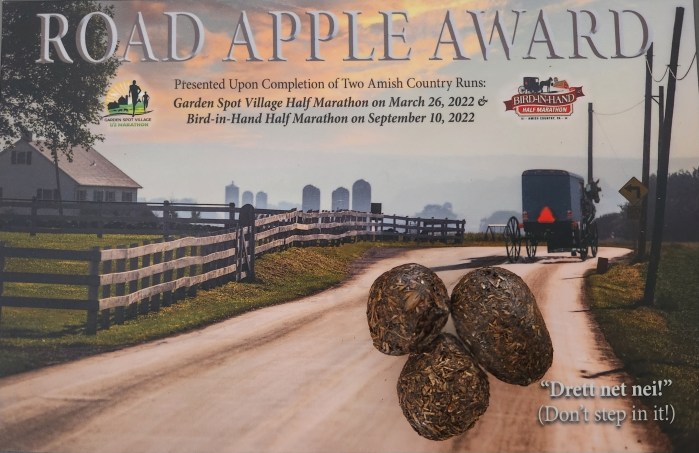 In addition to my horseshoe medal for the half marathon, I also received the coveted “Road Apple Award” for completing this race as well as the Garden Spot Half Marathon this past March.