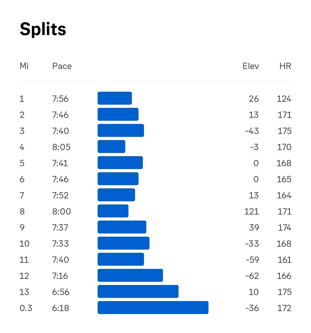 So the night before the race, I input a ‘workout’ into my watch. Four blocks of 3 miles with the target pace gradually speeding up from 8:00-8:15/mile (in the first 3 miles) to 7:30-7:44/mile (in miles 10 through 12) and then an all-out last mile (if possible). Breaking the distance into shorter blocks would allow me to focus on the block that I was in and the quicker paces would give me something to aim for to keep me motivated to push towards the finish line.